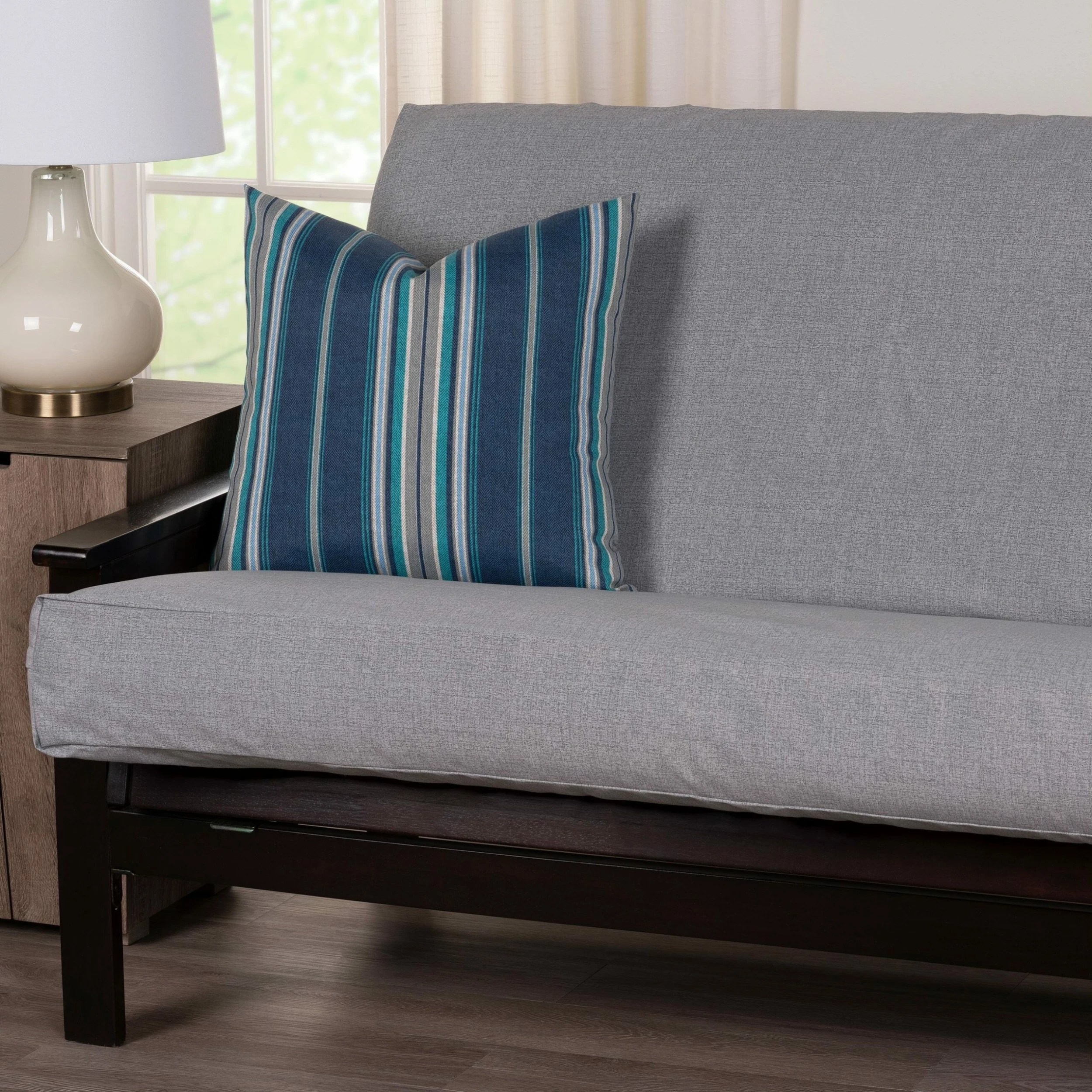 Safeguard your futon mattress by adding a futon cover! The Batiste Stone indoor- outdoor, easy-care fabric is a light heather-grey print that will blend with, and lighten up your treasured spaces. This Futon Cover by Siscovers can beautifully transition through the seasons as it is UV/fade, mildew, water and stain resistant. Made durable and easy to clean with just soap and water. You can either brush off loose dirt and gently hose down, or for those stubborn stains prepare a solution of 1 cup of bleach and 1/4 cup of mild soap (such as Woolite or Dawn dishwashing liquid) per gallon of clean water. The solution should be sprayed on (do not soak) the face of the fabric and gently brush. Do not keep the solution on the fabric for more than 2 minutes before rinsing with cool water. The cover features a three-sided zipper that opens the futon cover so it will lay flat, which makes it easy to put on and remove. Siscovers is a leading manufacturer of futon covers and other top-of-bed products. We have been making the highest quality futon covers for over 30 years.