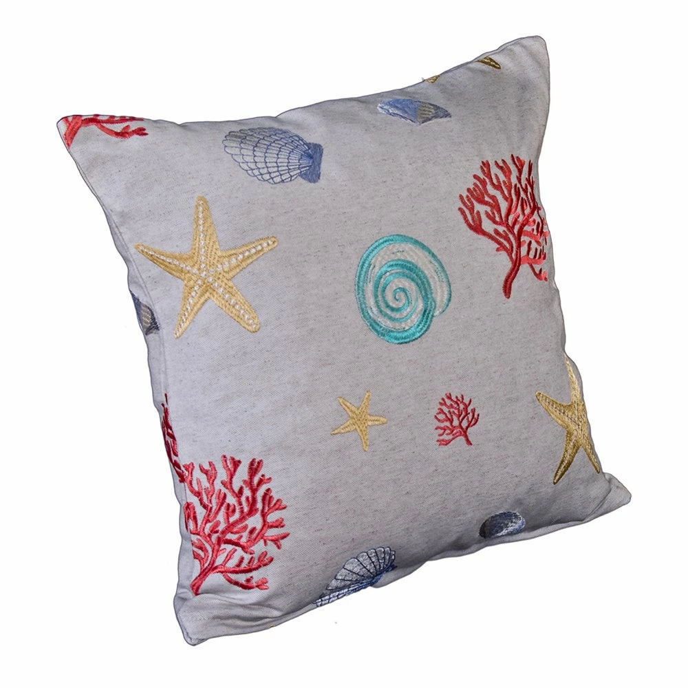 Create an island oasis in your living room with the Coral Reef Throw Pillow. This tropical pillow features embroidered sea shells, coral and star fish. The zippered closure and removable sham makes cleaning a breeze.