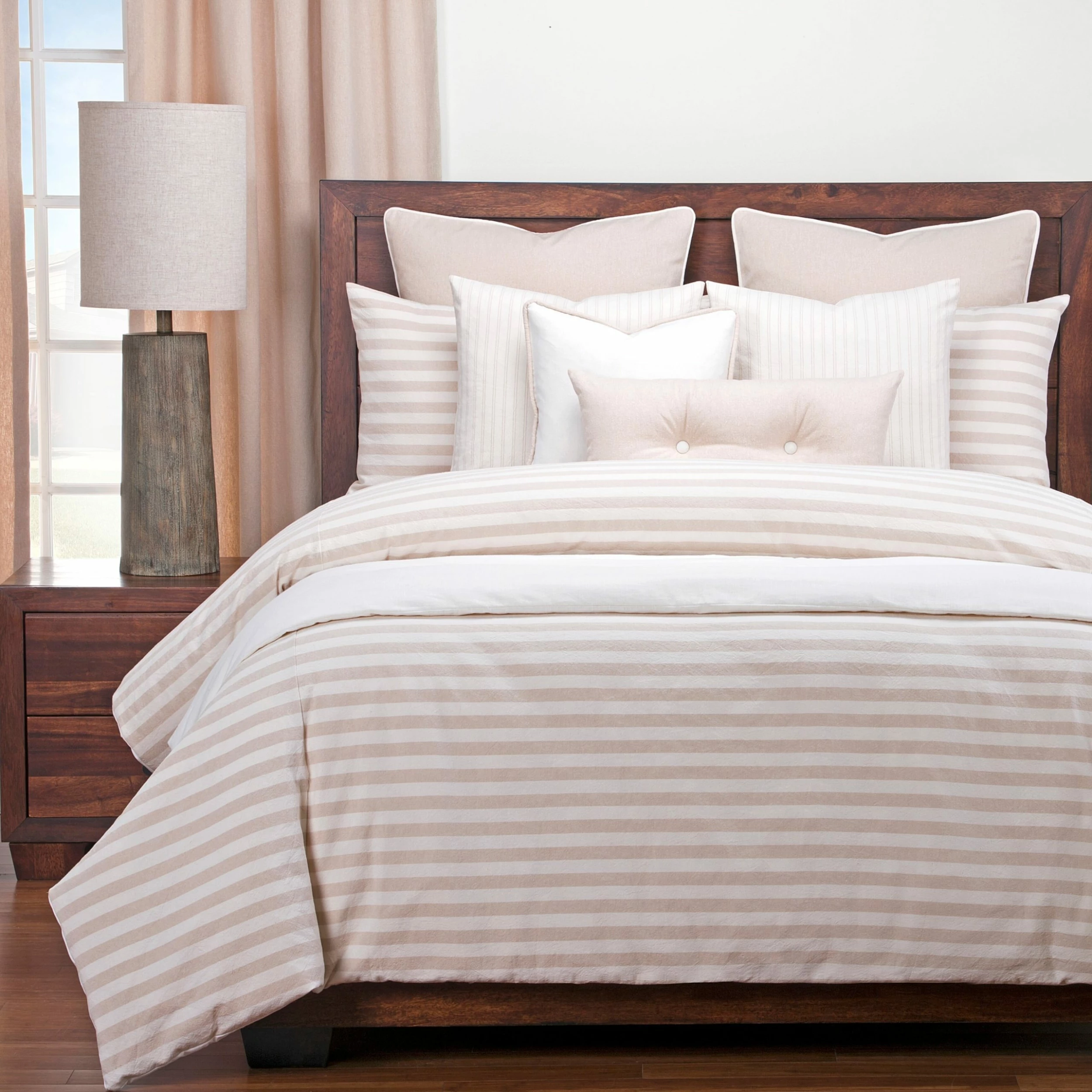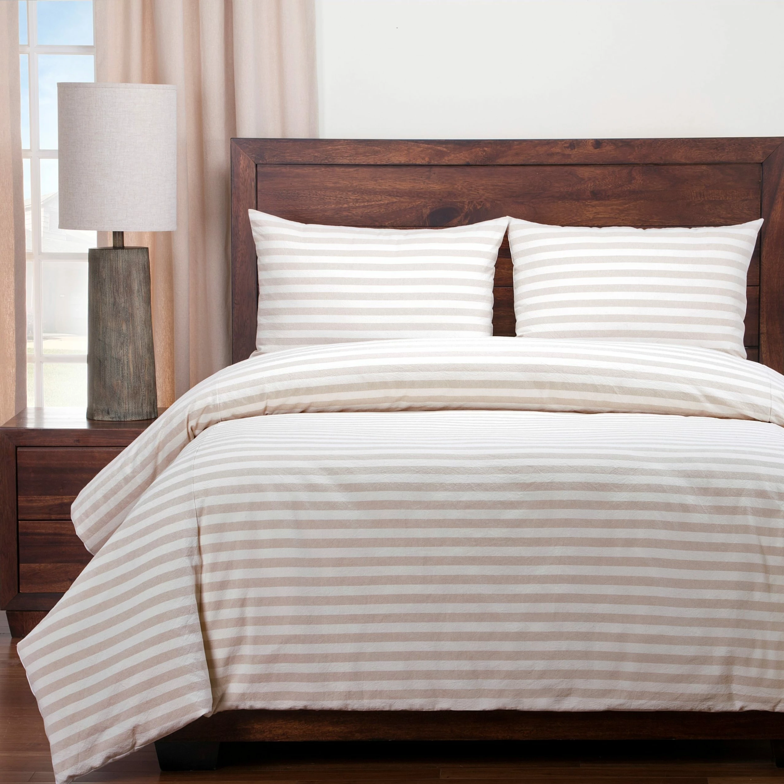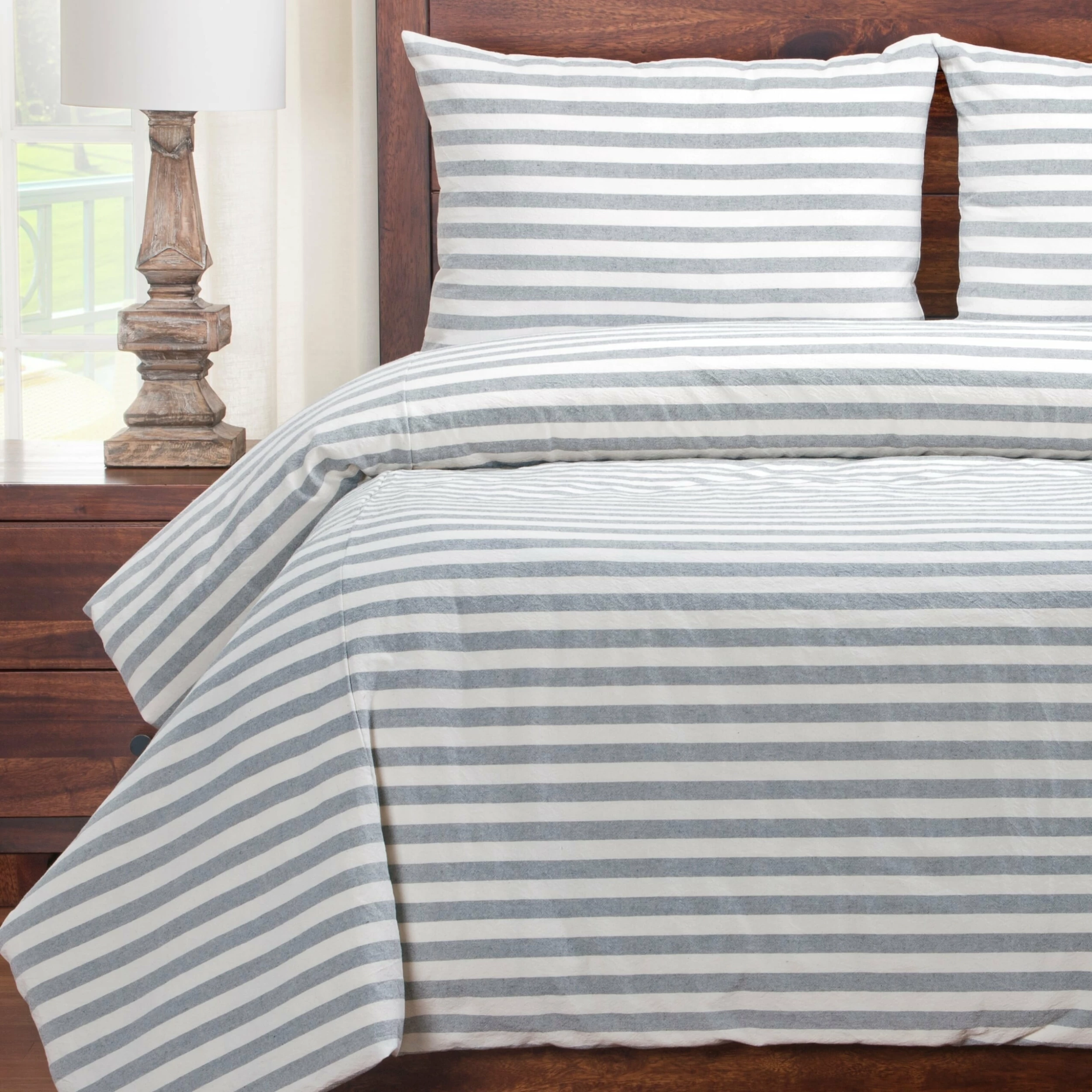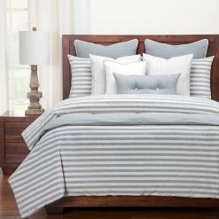 Natural and timeless, wide woven cotton stripes fresh from the farm forge this unfussy, unpretentious, completely cozy trend. This high-end 3 piece Farmhouse Stripe duvet and sham set features hidden zippers on both the duvet and shams for easy removal and care. This duvet is backed with a soft, brushed performance microfiber to ensure a comfortable night’s sleep. Manufactured in the USA, resulting in remarkable quality that is made to last and will keep your bedroom beautiful for years to come. This set includes one duvet cover and two matching shams (one in twin set). The Duvet has eight buttons inside to hold your comforter in place. The Siscovers Ultra Soft and Eco-friendly Down Alternative Comforter has corresponding button holes that line up perfectly with the hidden buttons inside.Duvet Dimensions:Cal King: 104 inches x 100 inchesFull: 86 inches x 88 inchesKing: 104 inches x 98 inchesQueen: 94 inches x 98 inchesTwin: 67 inches x 88 inches Sham Dimensions:Standard: 26 inches x 20 inchesQueen: 30 inches x 20 inchesKing: 36 inches x 20 inches