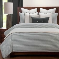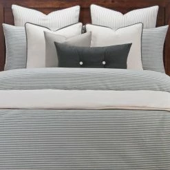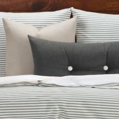 Bring timeless style to any bedroom with the Everlast Stripe Juniper stain resistant bedding set from Revolution Plus. Revolution Plus bedding is made to last; Life is messy, but paw prints , juice spills and even permanent marker will disappear! Soft to the touch inherently stain resistant and bleach cleanable… Even dark colors! Revolution Pus bedding is made with upcycled fibers with no chemical treatments making them easy on the environment. This High end set includes the following: One duvet cover, two pillow shams (one in twin set), one comforter, one 16″ x 16″ toss pillow and one 26″ x 14″ buttoned toss pillow. The duvet cover is backed with an ultra-soft sheeting material for added comfort. The duvet cover and shams have zipper closures for easy cleaning. The comforter buttons in 8 places to ensure it does not shift in the cover. This set is available in Twin, Full, Queen, King and California King. Duvet dimensions:Twin: 67 inches wide x 88 inches longFull: 86 inches wide x 88 inches longQueen: 94 inches wide x 98 inches longKing: 104 inches wide x 98 inches longCal King: 104 inches wide x 100 inches longSham dimensions:Standard: 26 inches wide x 20 inches longQueen: 30 inches wide x 20 inches longKing, 36 inches wide x 20 inches long