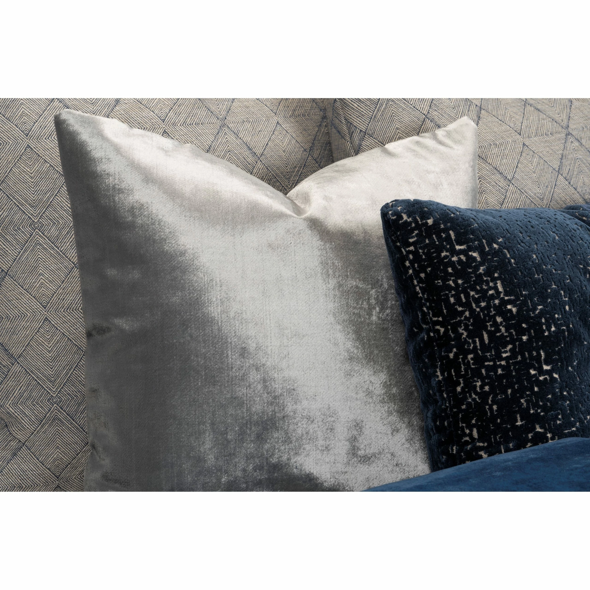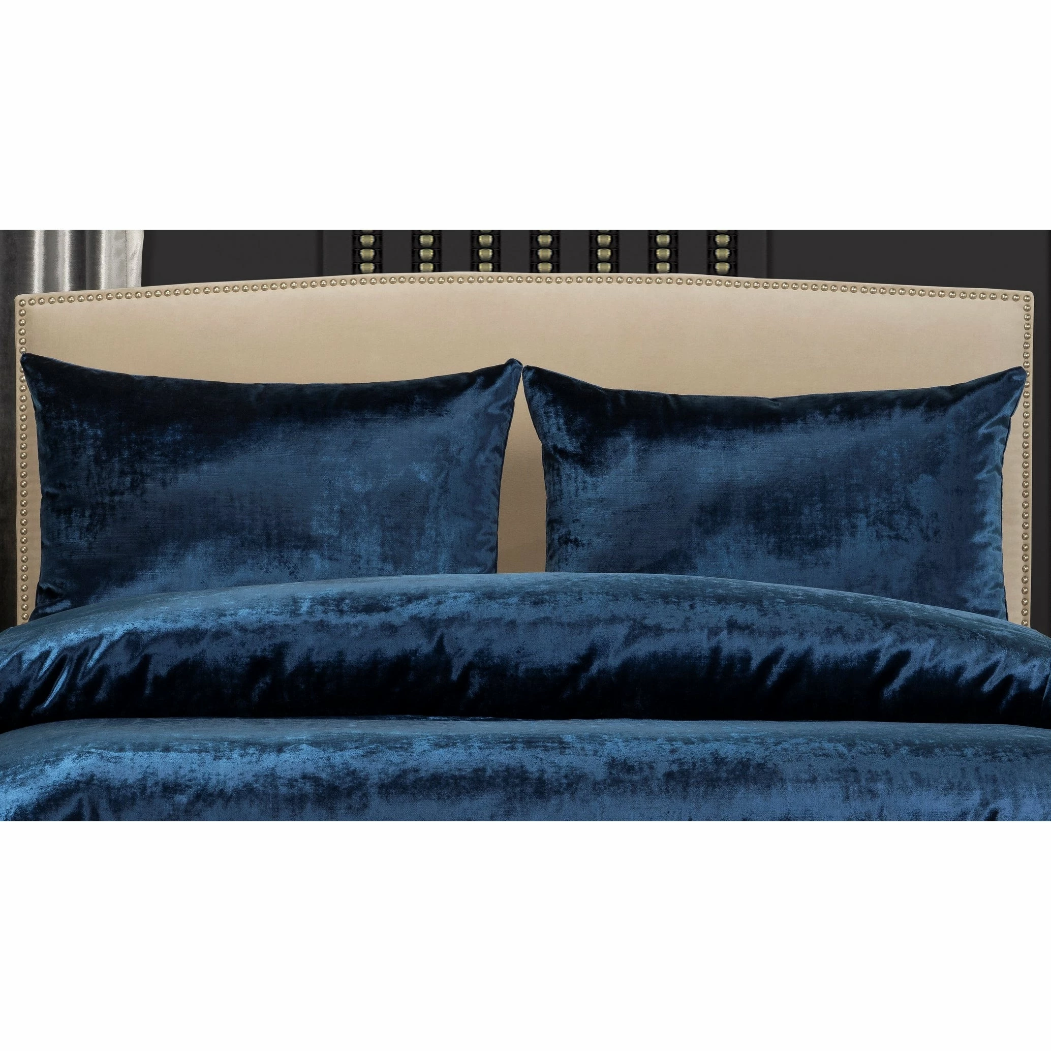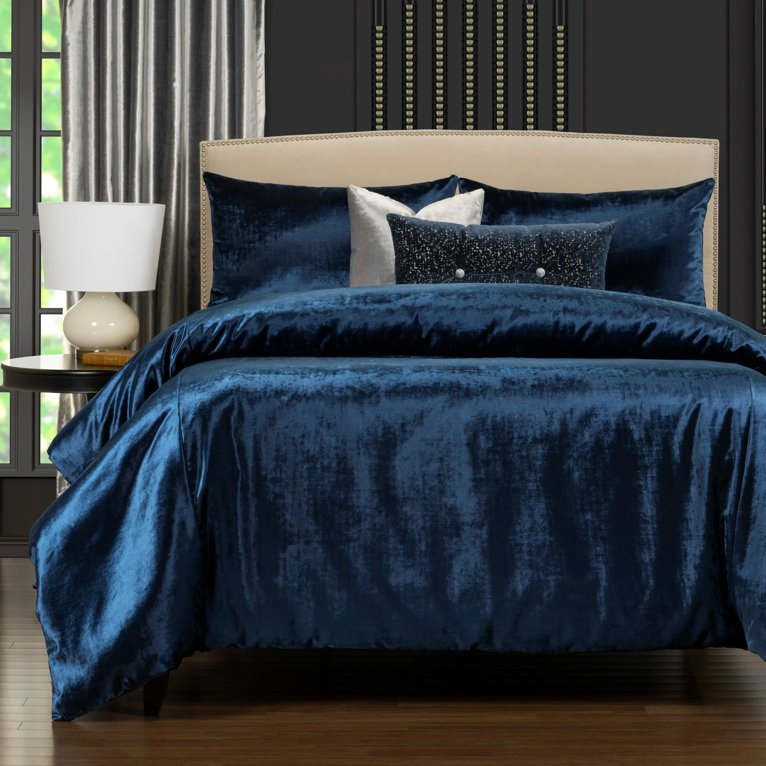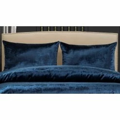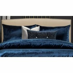 Easy care! This fabric is 100% polyester and machine washable. Β The duvet cover and shams are a velvety-soft plush luxury in a deep royal blue. Β The 16″ x 16″ throw pillow is velvety-soft in gleaming sterling silver with zipper closure for easy on and off. Β The 26″ x 14″ button tufted throw pillow is an intoxicating regal blue, deeply textured with a soft suede matte finish.