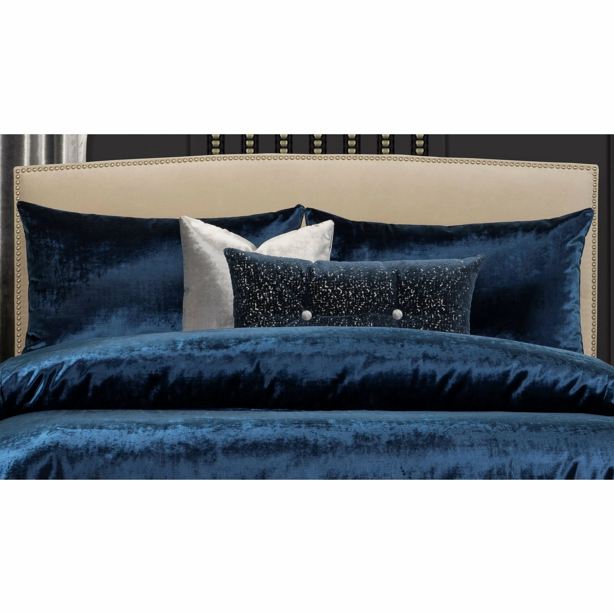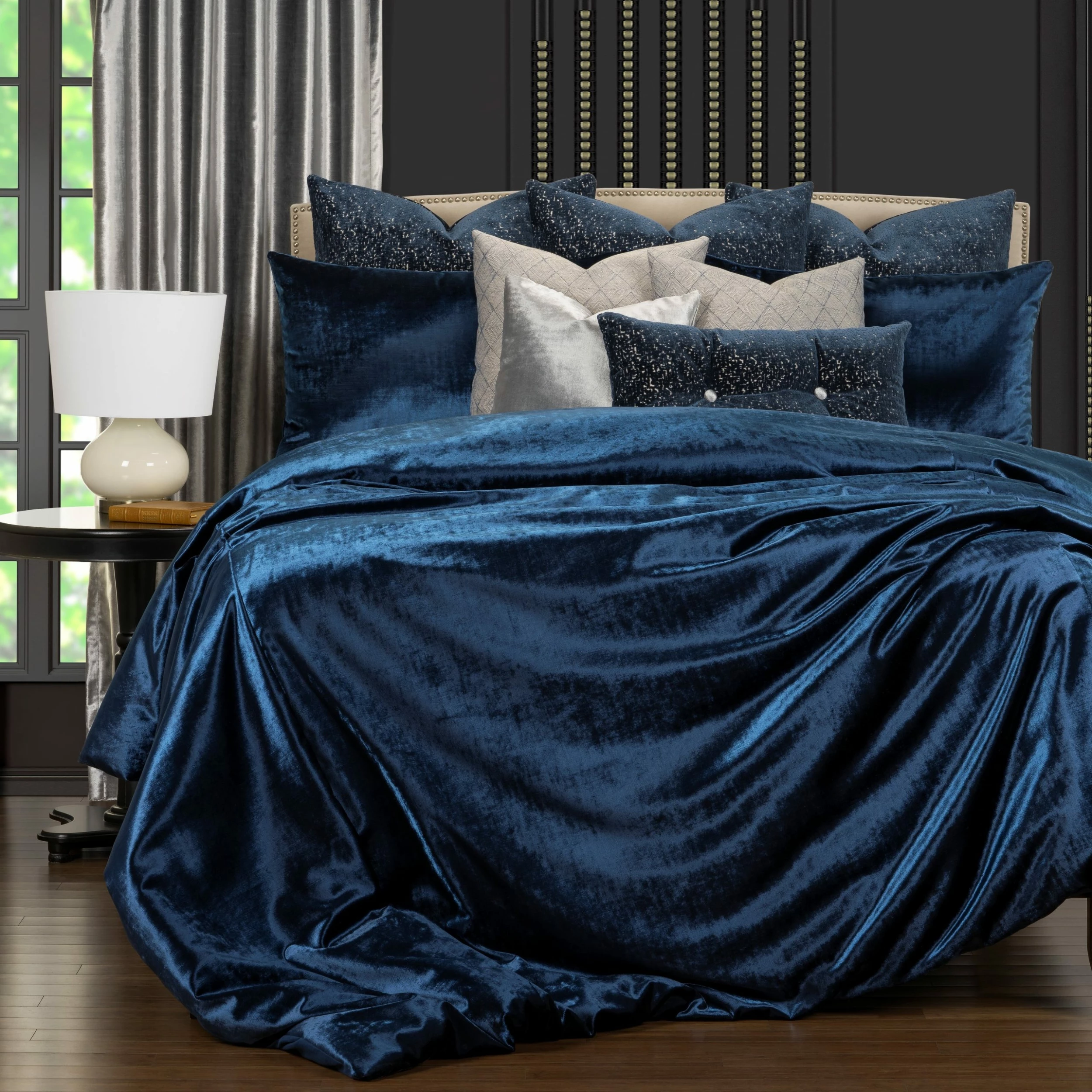 F. Scott Fitzgerald’s Wild Child bedding collection is a lavish blue velvet that provokes a sensual mystery with its depth of color as it offers a refuge of comfort. Β
