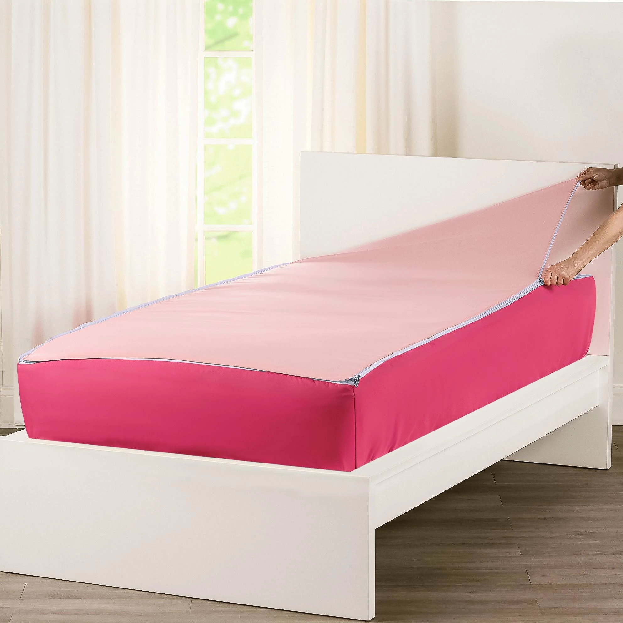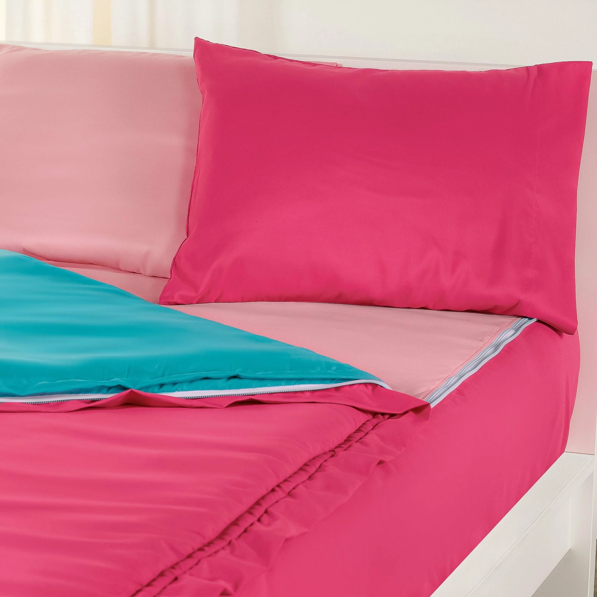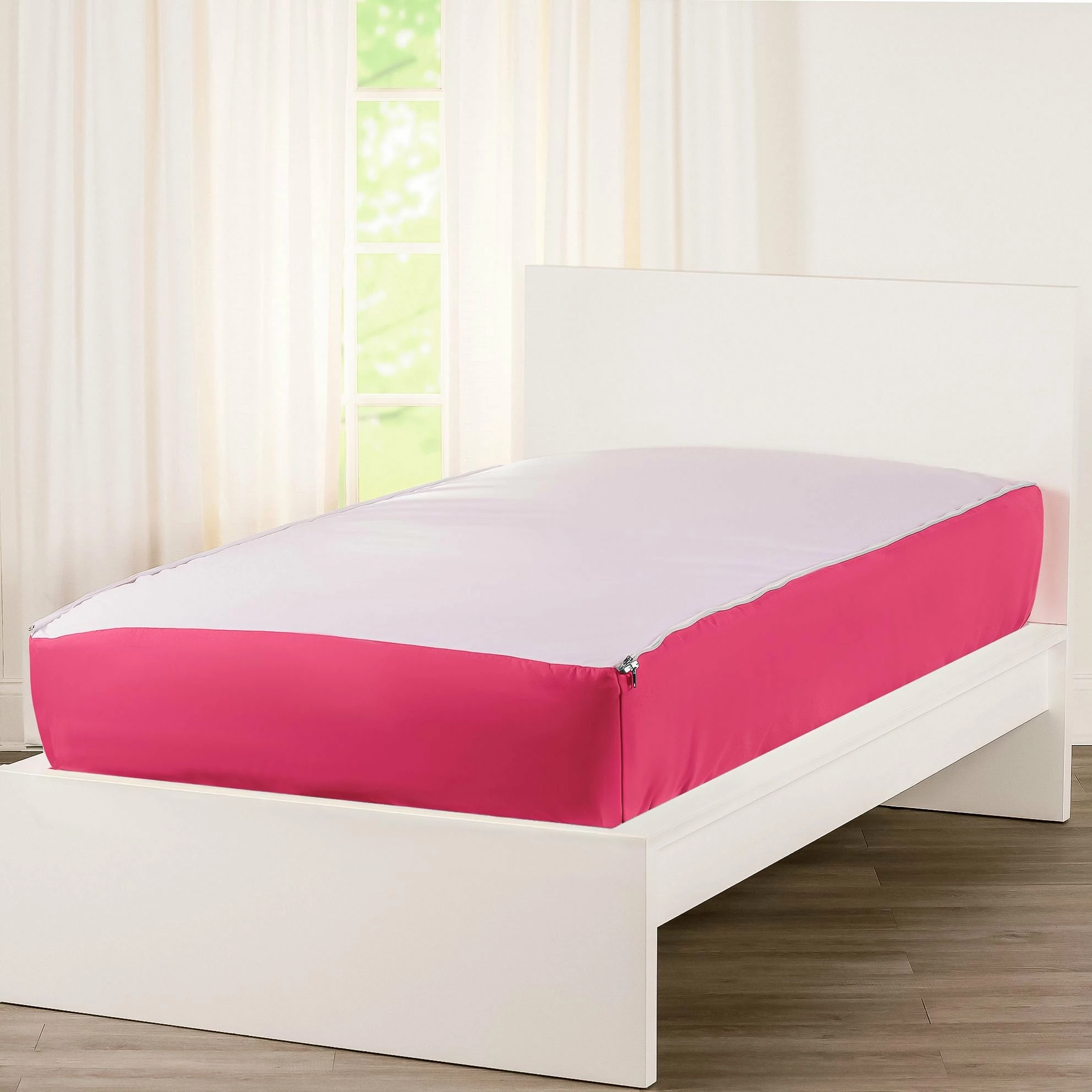 Update your child’s bed with the Hot Pink Bunkie Deluxe from Siscovers. This all-in-one zipper bedding set has everything you need to send your little ones off to dreamland. The removable snuggly comforter is a perfect medium weight for all seasons. The zipper that runs along the perimeter of the bed make it so easy to make the bed, leaving it neat and tidy in a flash. The Bunkie Deluxe goes on easy just like a fitted sheet. It easily fits over your mattress with a heavy-duty elastic that goes all the way around the bottom of the mattress. The detachable comforter and bottom sheet easily zip on and off, making laundry a breeze. Under the removable comforter and sheet, you will find a built-in mattress protector that protects the top of the mattress from any spills or accidents. Also included you will find matching pillowcases to complete the look. These envelope style cases keep your pillows tucked away safely inside. This revolutionary product not only has everything you need in one easy package. It looks great, is fun to use and is available in both Twin and Full sizes. This product not only looks great on bunk beds but panel and platform beds too! Dimensions: Twin-size Bunkie Deluxe (39″ x 75″x 16″), Includes 2 standard pillow cases (26″ x 20″)Full-size Bunkie Deluxe (54″ x 75″ x 16″), Includes 4 standard pillow cases (26″ x 20″)