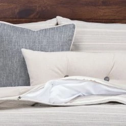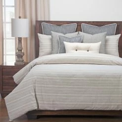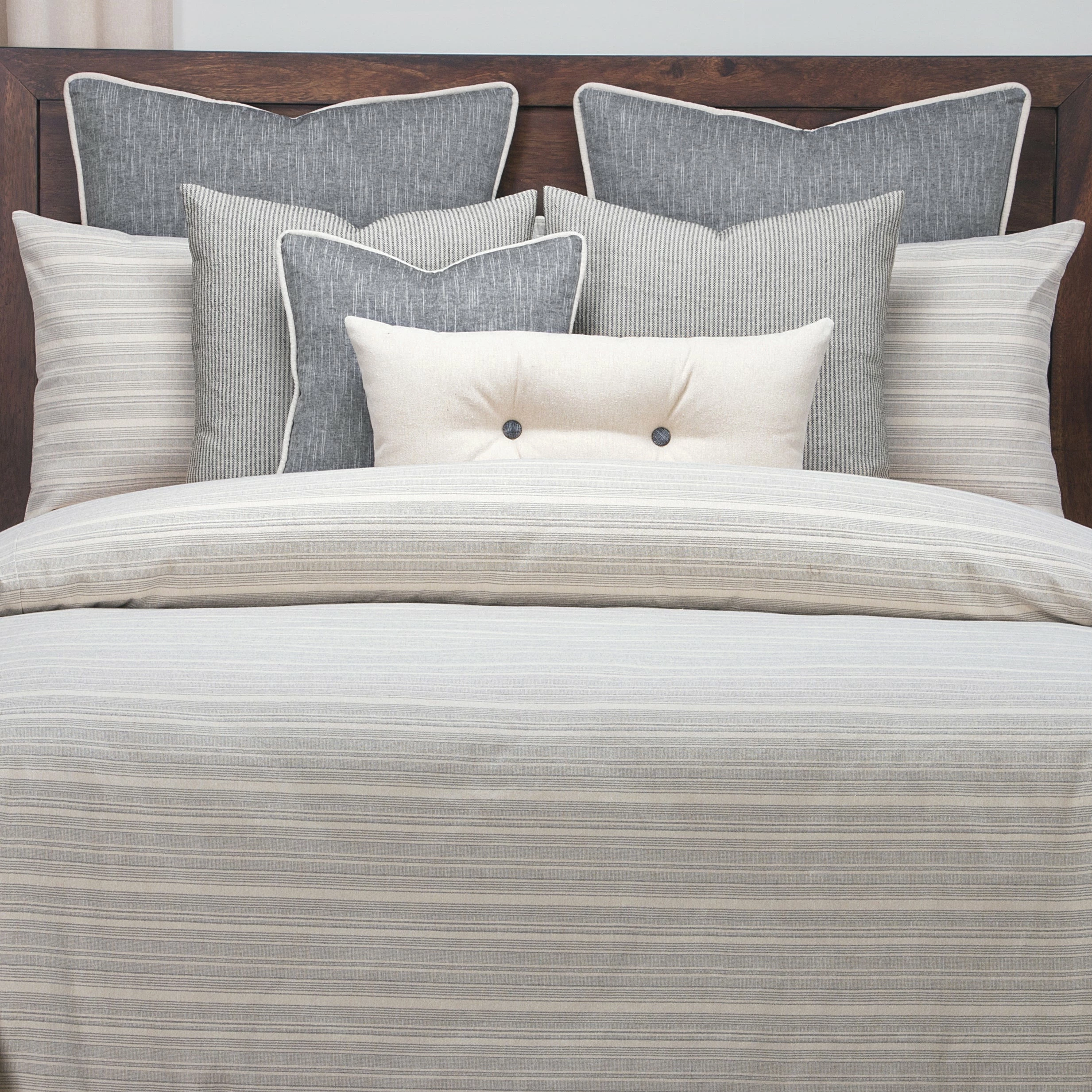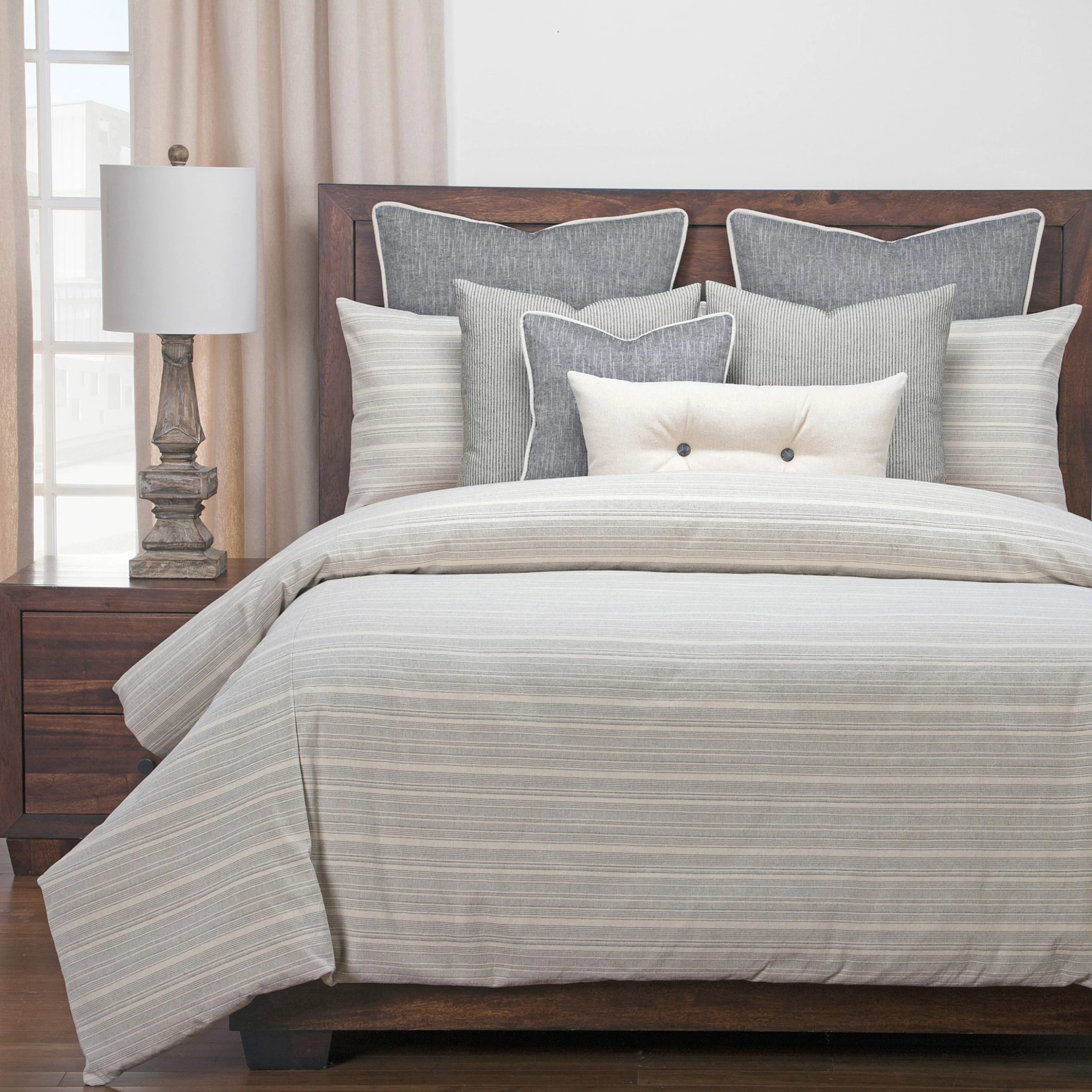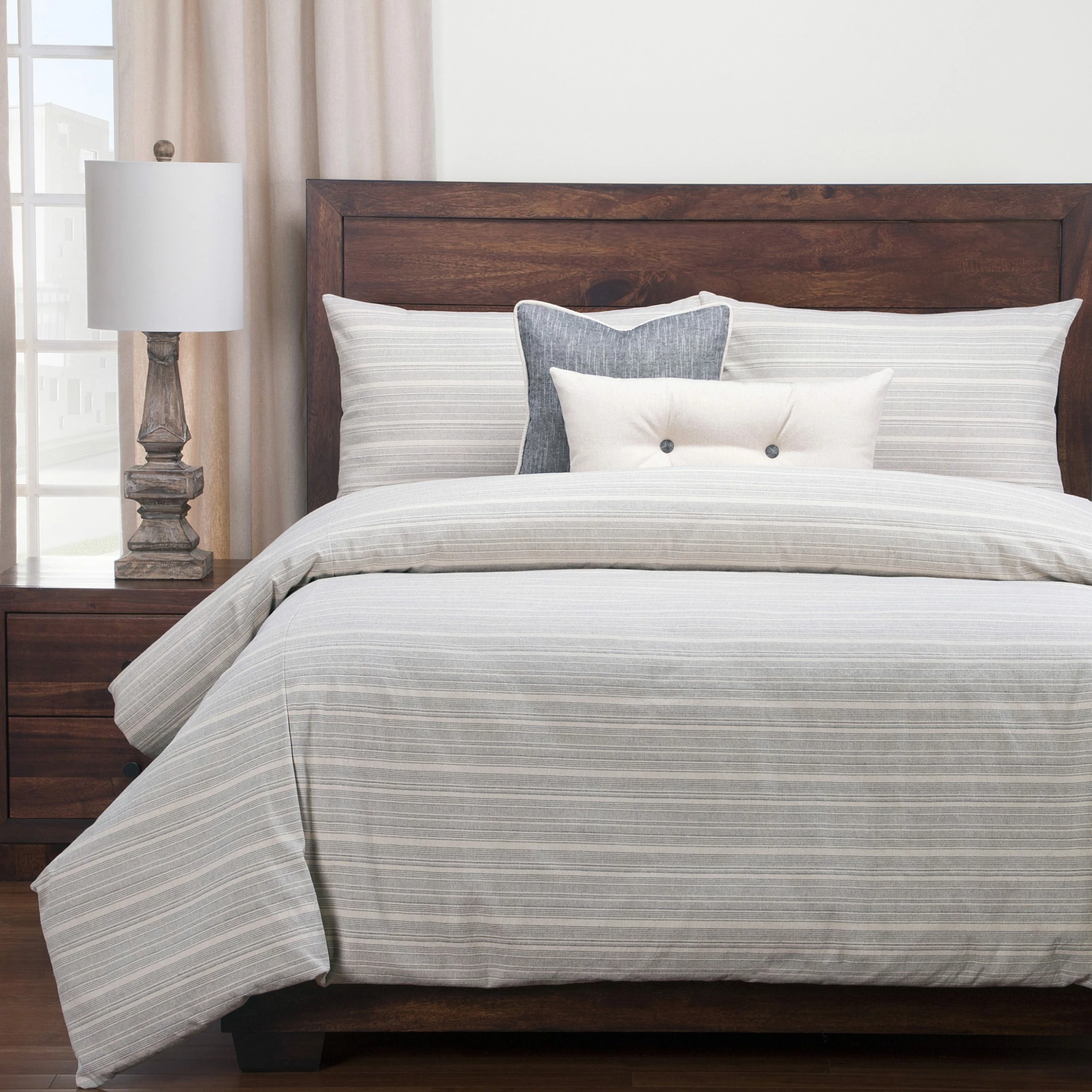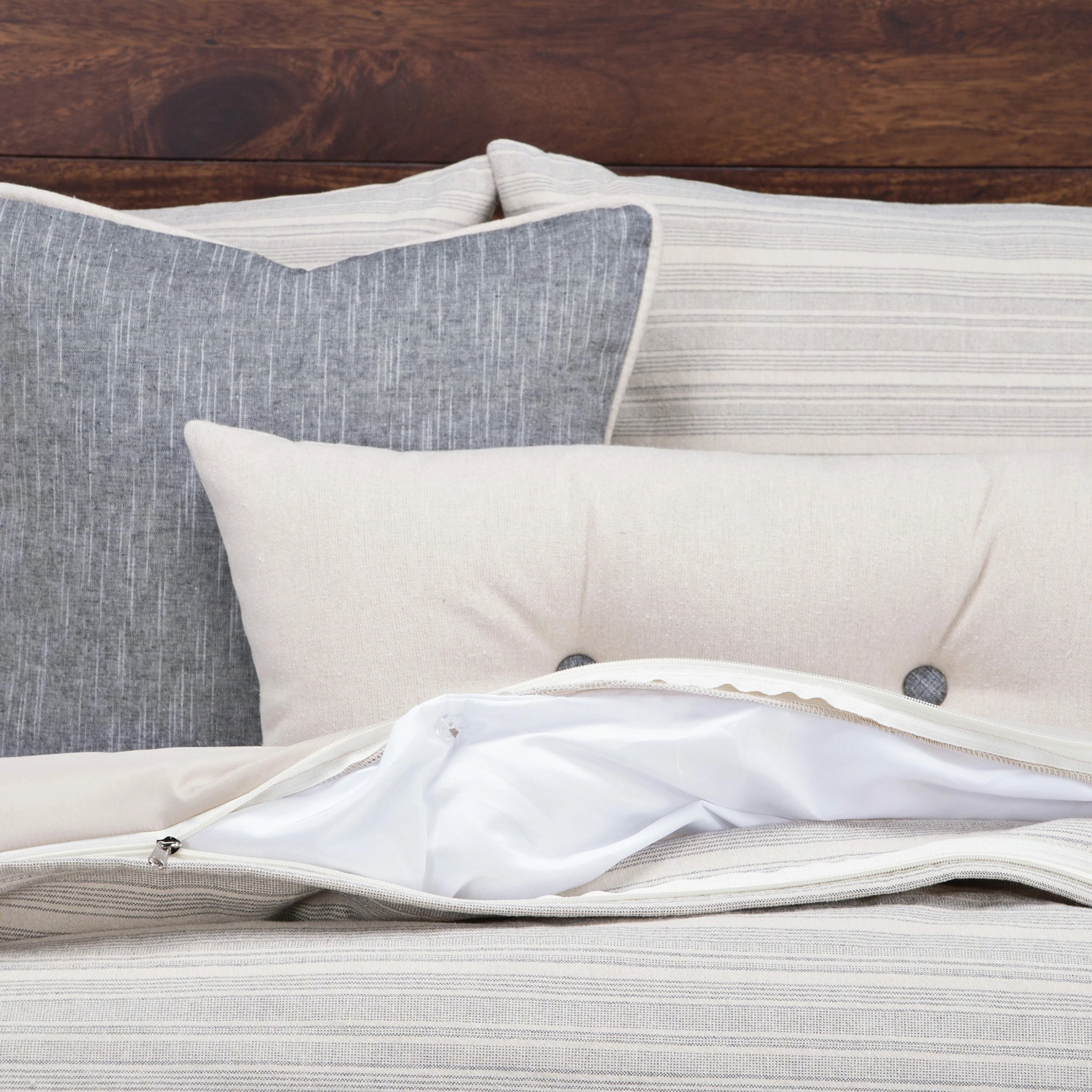 Sun-stained stripes of well-worn Slate will infuse your home with warmth and welcome. Bring the on trend farmhouse look into your home with this machine washable luxury duvet set. This High end Cotton-blend set is made to last and includes the following: One duvet cover, two pillow shams (one in twin set), one comforter, one 16′ x 16′ toss pillow and one 26′ x 14′ buttoned toss pillow. The duvet cover is backed with an ultra-soft sheeting material for added comfort. The duvet cover and shams have zipper closures for easy cleaning. The comforter buttons in 8 places to ensure it does not shift in the cover. This set is available in Twin, Full, Queen, King and California King. The duvet cover is filled with our eco-friendly down alternative comforter. Stuffed with a medium-weight fill made from recycled plastic bottles, this fluffy comforter benefits your health and the environment when compared to natural down.
