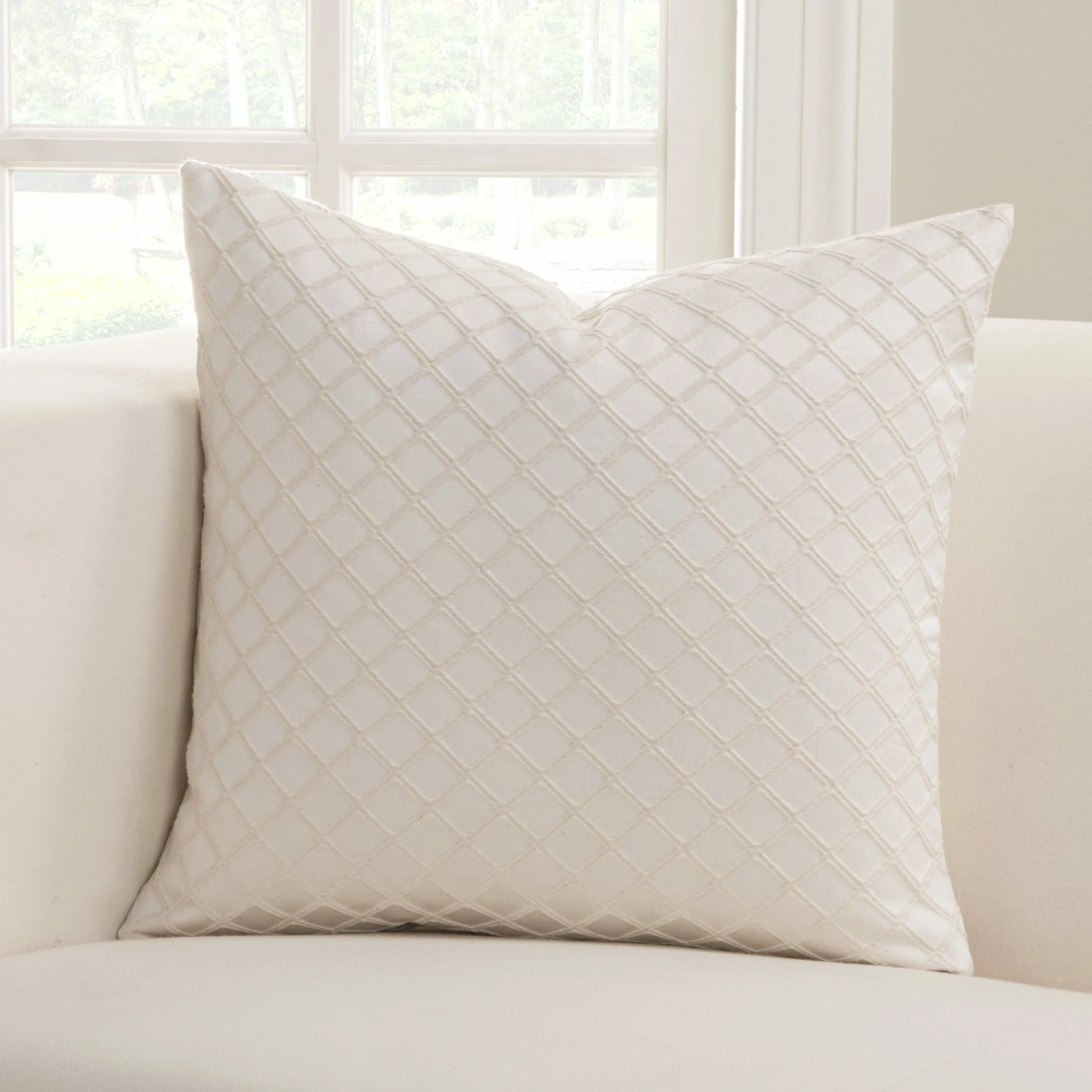 Infuse your living room design with a charming decorative piece that blends classic and contemporary styles with this ivory-colored throw pillow. Diamond-stitched texture provides a luxurious appearance that makes it appropriate for all seasons.