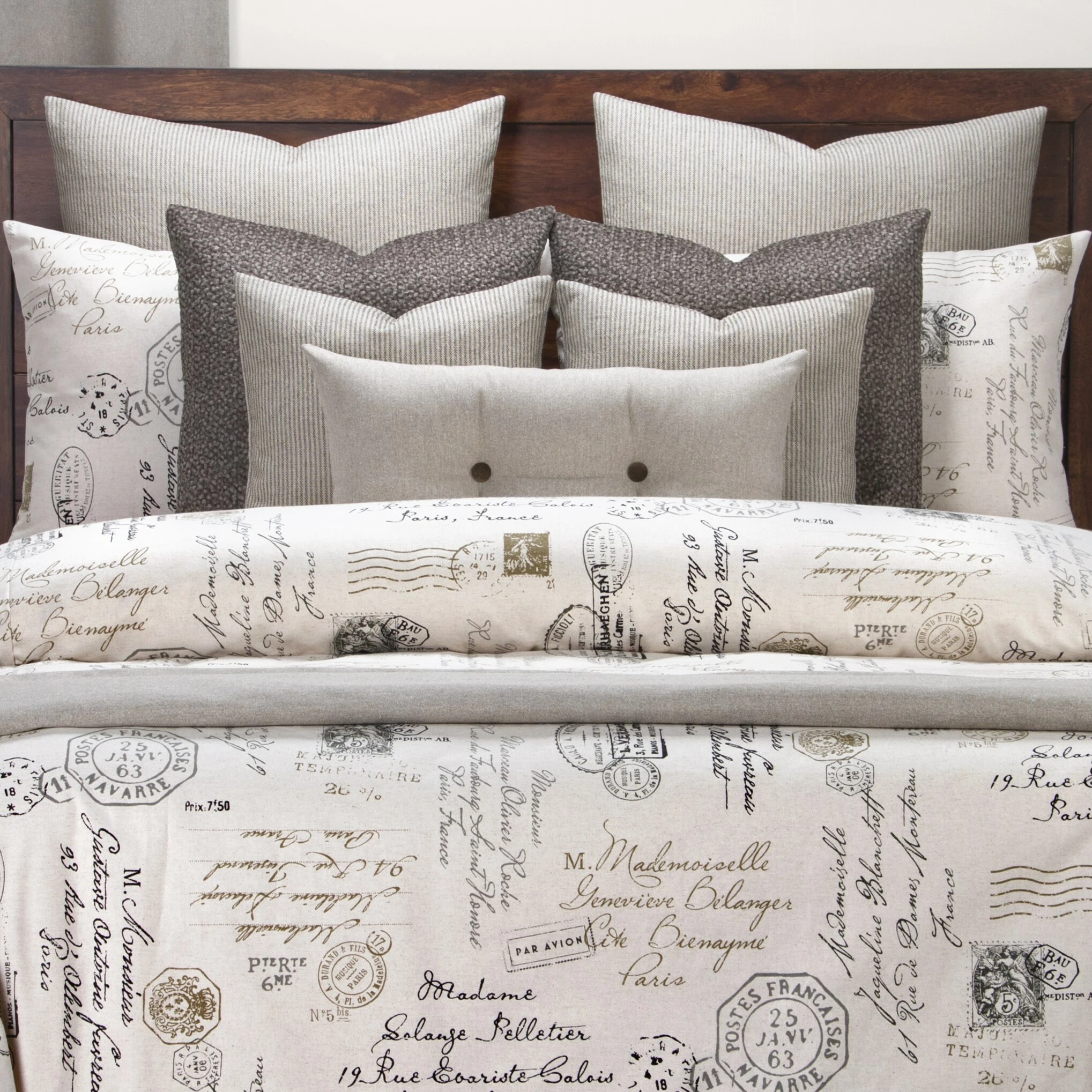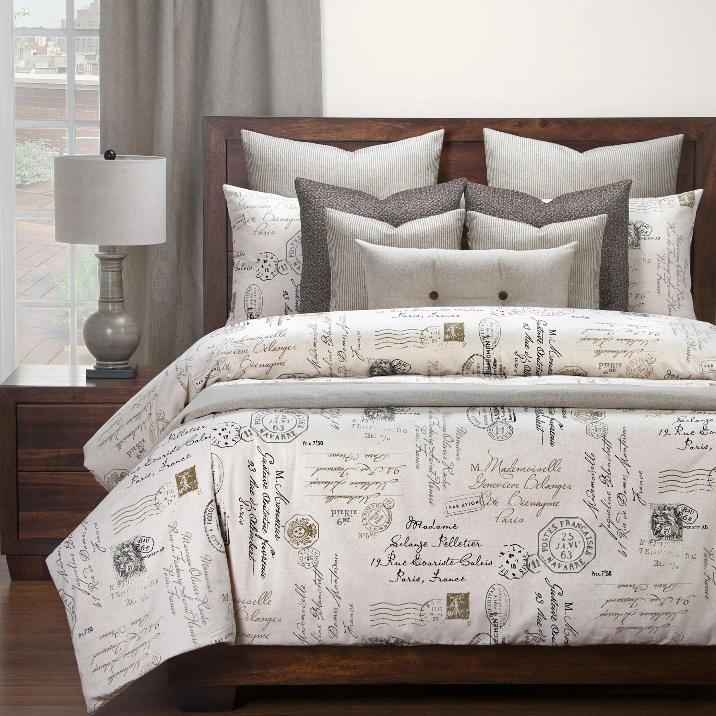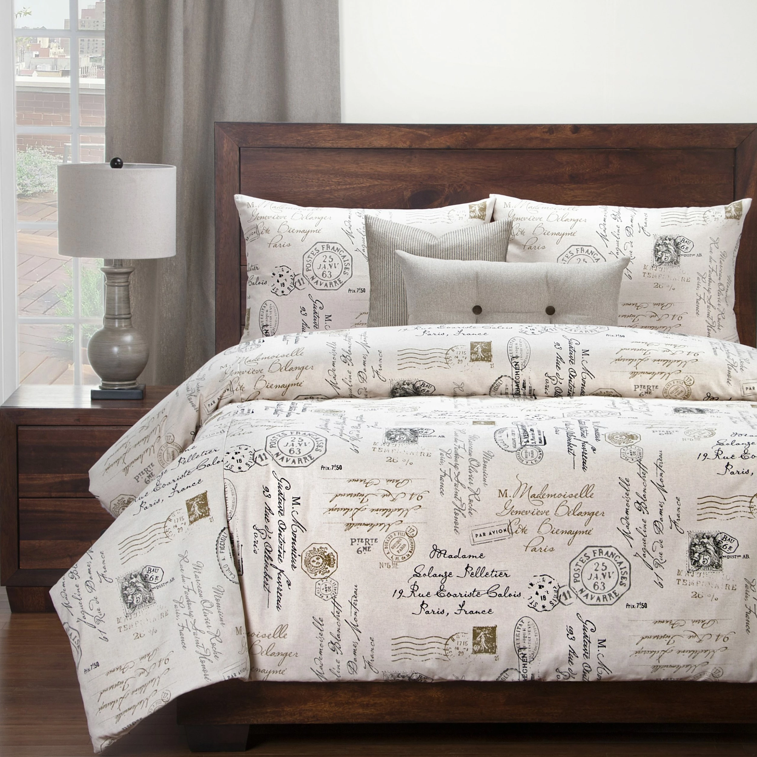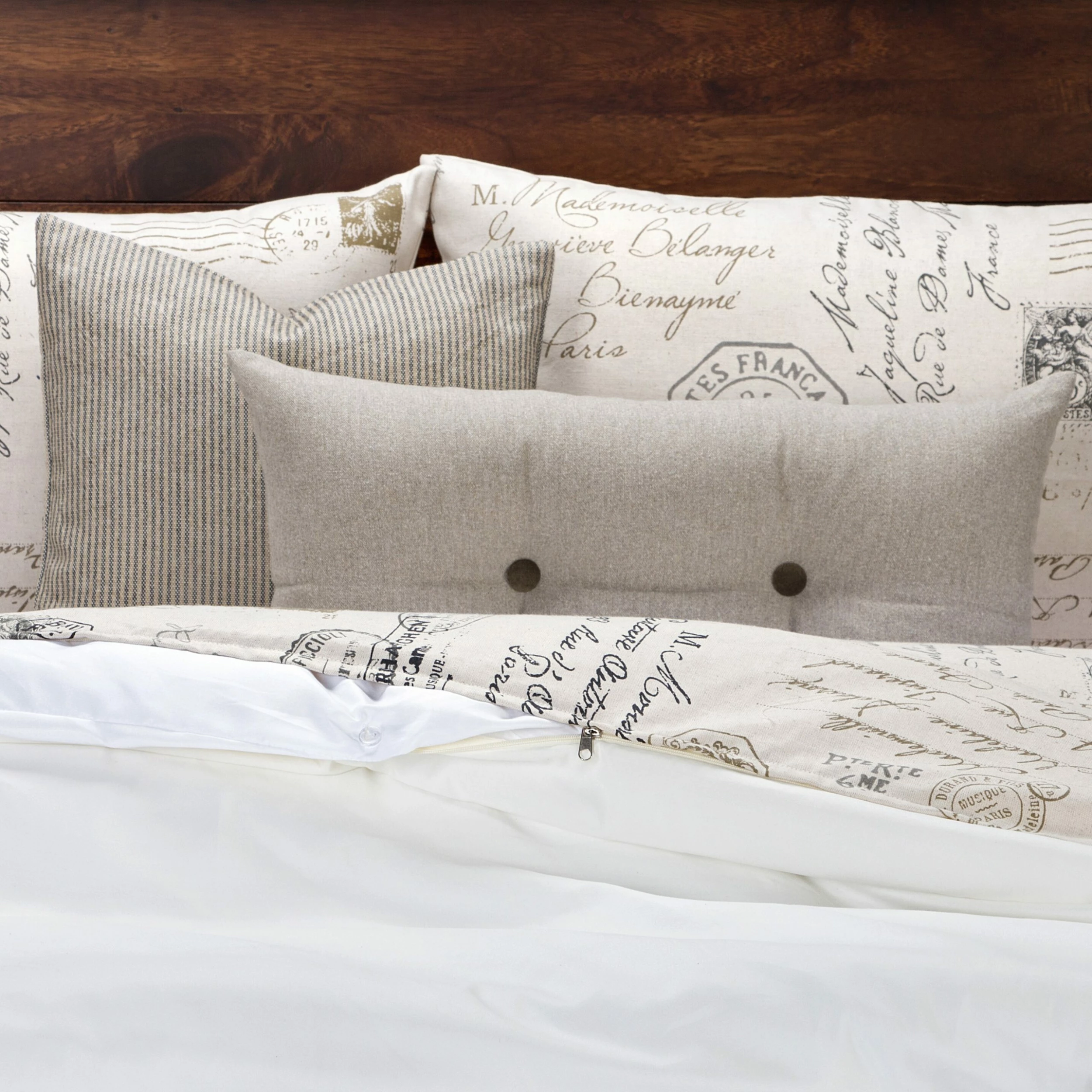 Channel dreams of world travel with this Siscovers Postscript duvet cover set. French script with a postcard-style design give this set a unique look, and the cotton and linen construction offers extra comfort. Eight buttons help secure this cover in place to prevent bunching and gathering. This set features two accent pillows for a plush finishing touch.