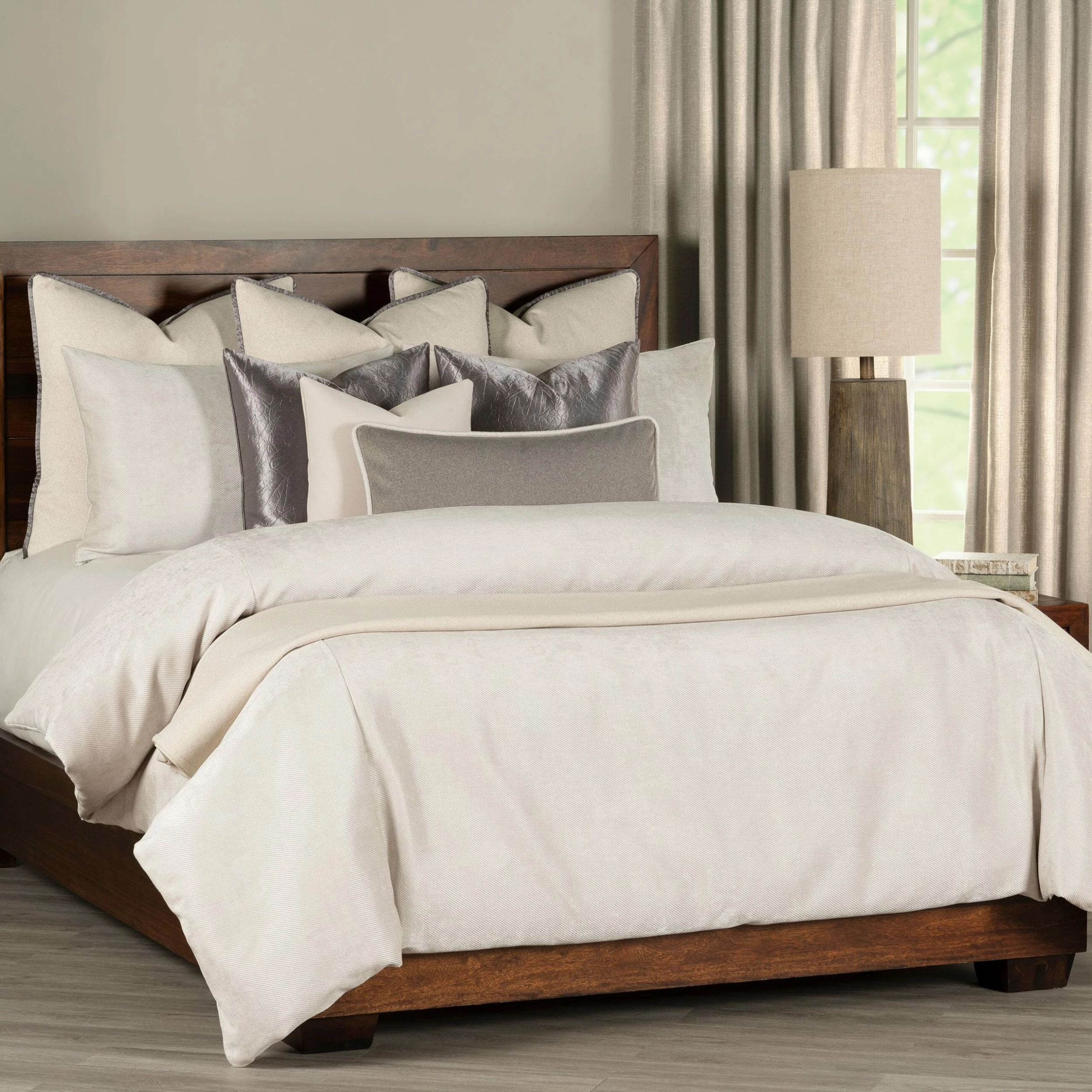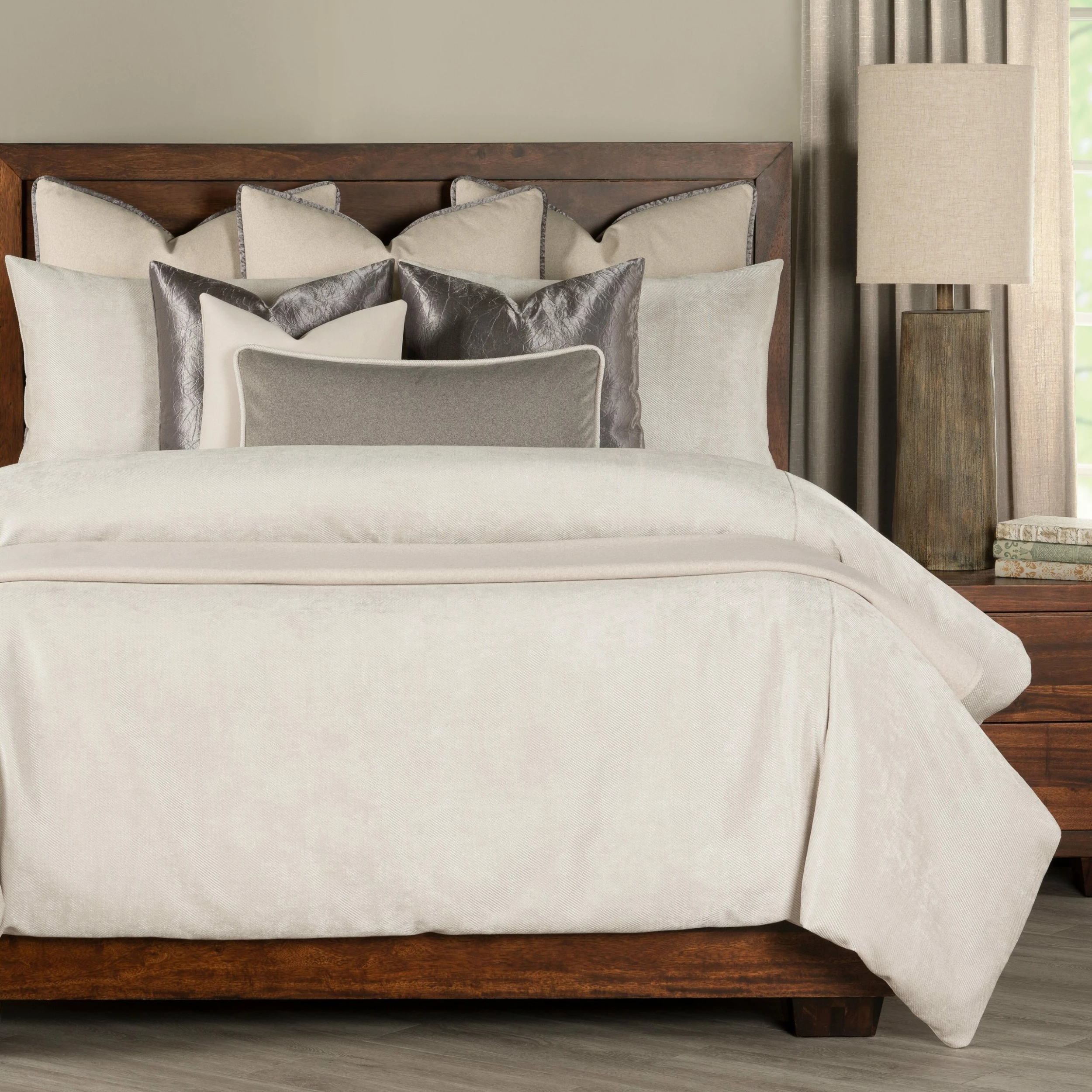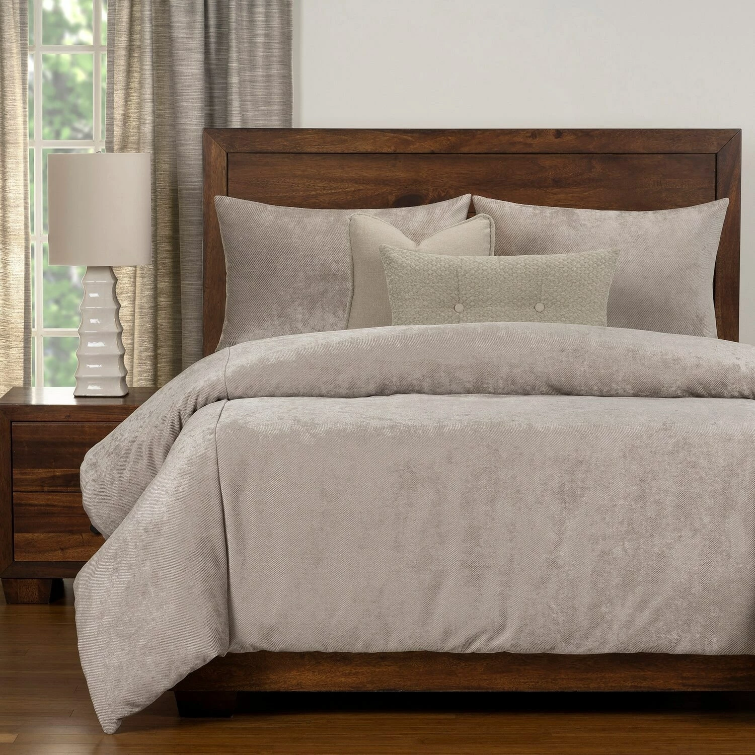 Tasha Bedding Collection, velvety chenille with diagonal channels finished with a polished luster. The fabric is 100% polyester and machine washable. Β Easy care! Β The duvet cover and shams are soft, with diagonal, and narrow ribbing. The set includes one 16″ x 16″ throw pillow and one 26″ x 14″ throw pillow.Β